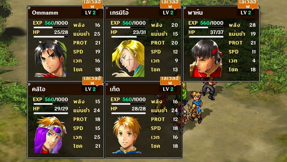 - UI และเมนูที่เข้าใจง่าย: หน้าต่าง Status ตัวละคร (ภาพแรก) แสดงค่าพลังต่างๆ HP, EXP, พลัง, แม่นยำ, PROT (ป้องกัน), SPD (ความเร็ว), เวท, โชค เป็นภาษาไทยทั้งหมด ทำให้ผู้เล่นใหม่ หรือใครที่ไม่ถนัดภาษาอังกฤษ สามารถทำความเข้าใจระบบเกมได้อย่างรวดเร็ว ไม่ต้องเสียเวลาเดาหรือเปิดดิกชันนารีอีกต่อไปค่ะ แม้แต่คำว่า “เลเวล” หรือ “EXP” ก็มีการทับศัพท์อย่างเข้าใจง่าย